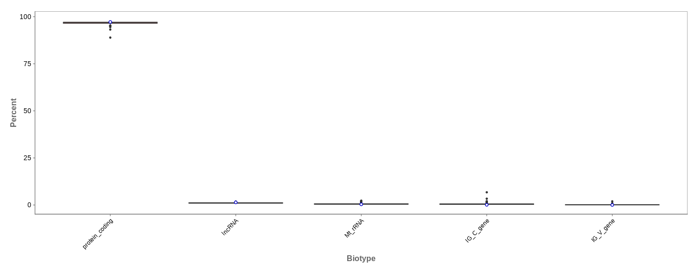 The biotype (that is functional types of the genes to which reads are mapped) can be used for quality control. The protein_coding should be the highest and not far away from 100%. We can also see in our example that there we have IgC and IGv genes for tuberculosis data, which seems reasonable because they are relevant for the immune/antibody system of humans.