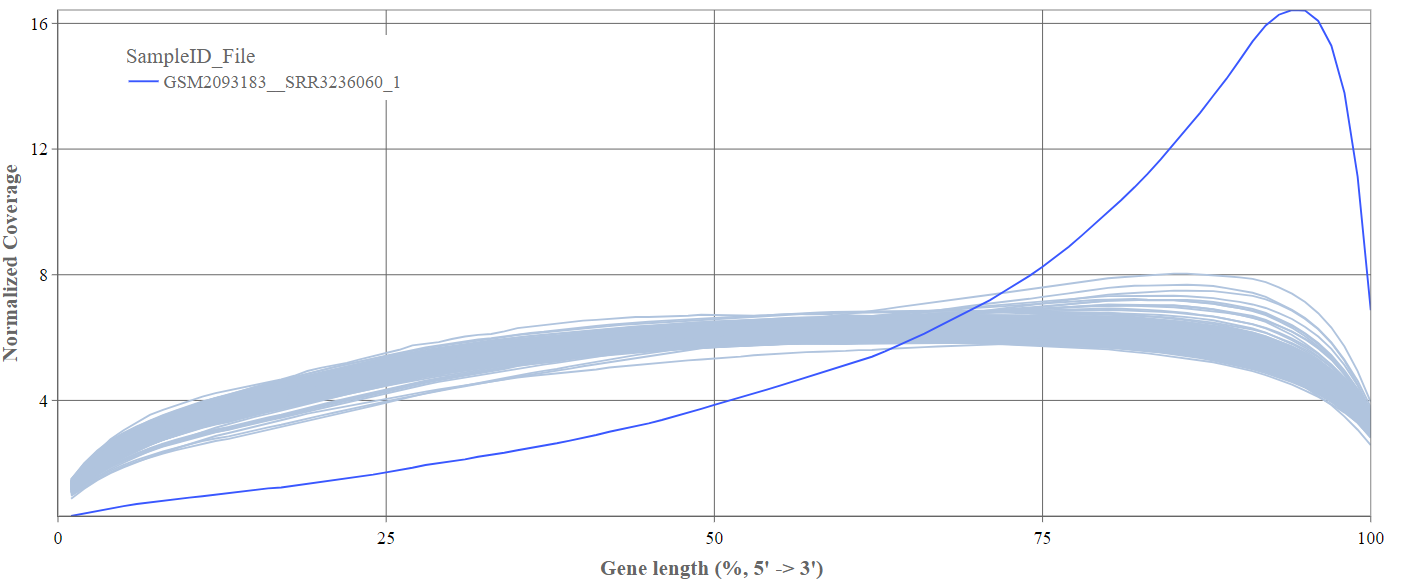 We can see the normalized coverage. The samples gene body coverages should be close to one another and should form a homogeneous band and, in BulkRNA-Seq, should be spanning quite ‘uniform’ over the gene length going down at the start and endpoints. Please note that evoenthouth this QC section is called gene body coverage we effectively measure the coverage along the RNA transcripts corresponding to the gene.